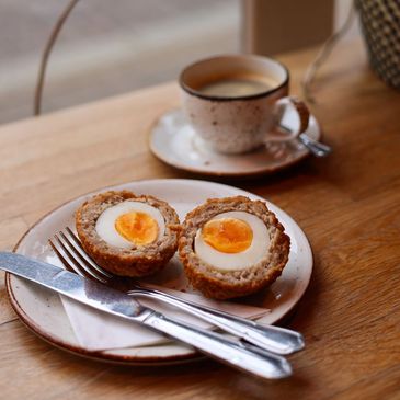Free-range egg wrapped in seasoned pork sausage meat, coated in crisp golden crumbs